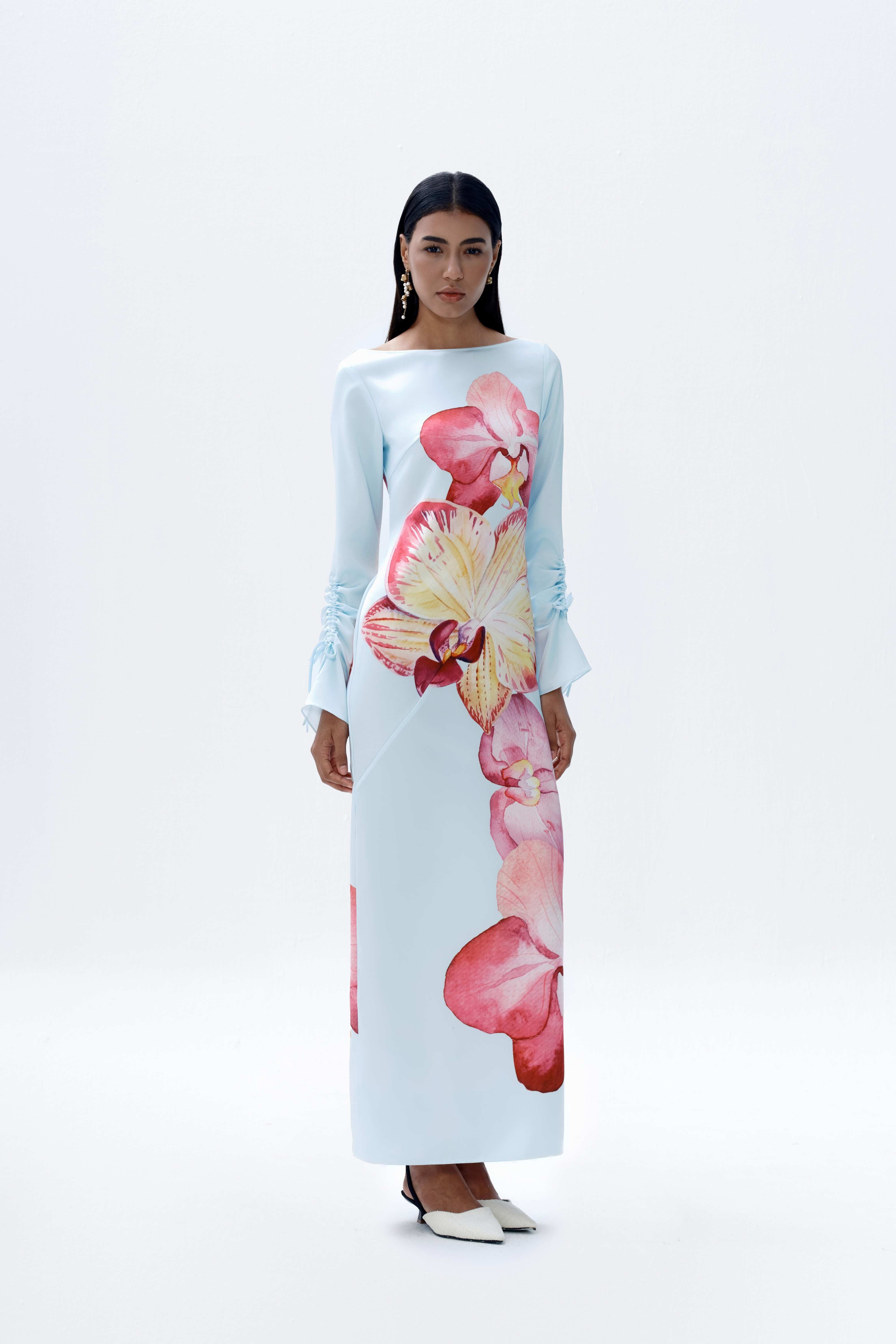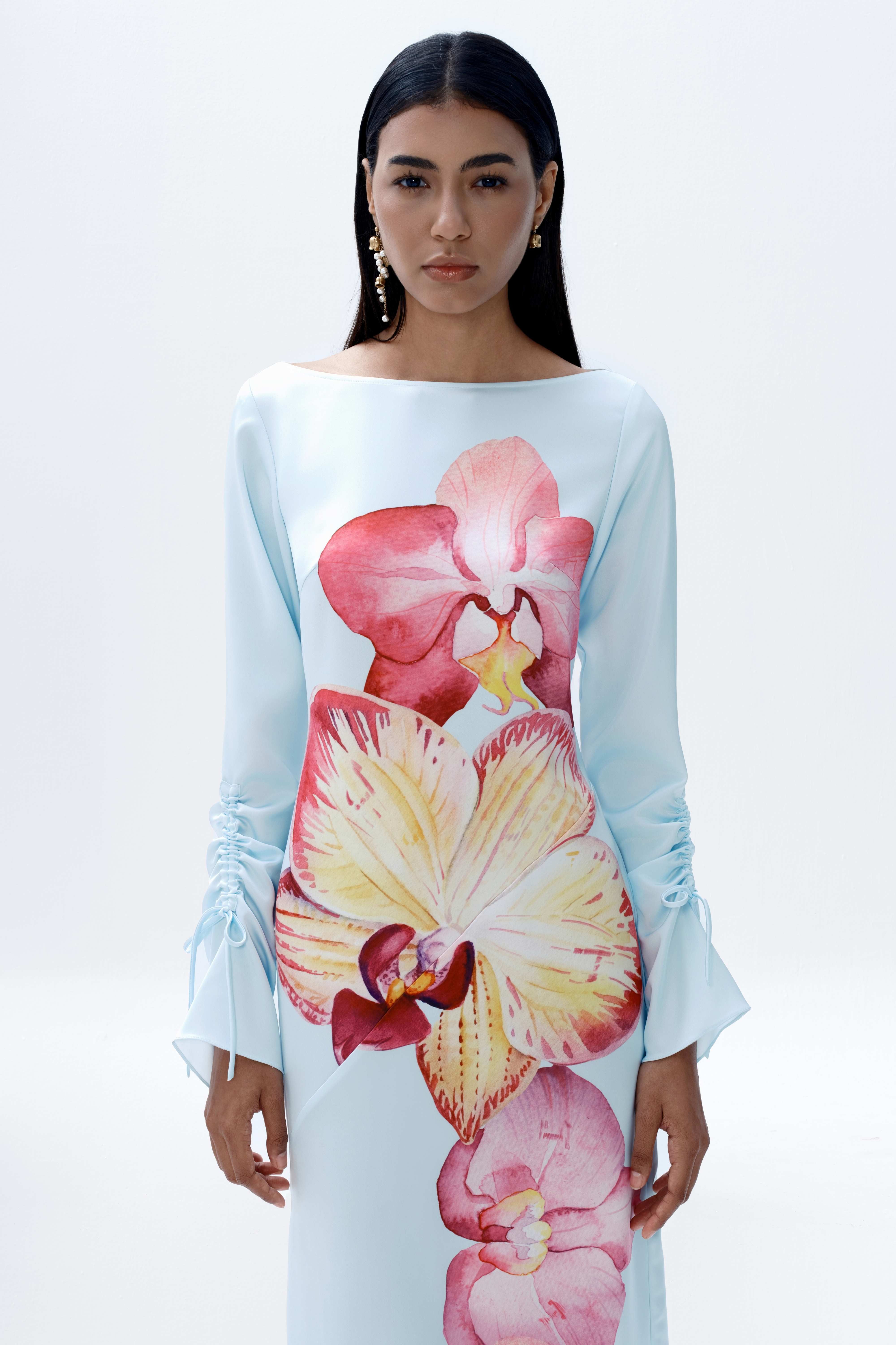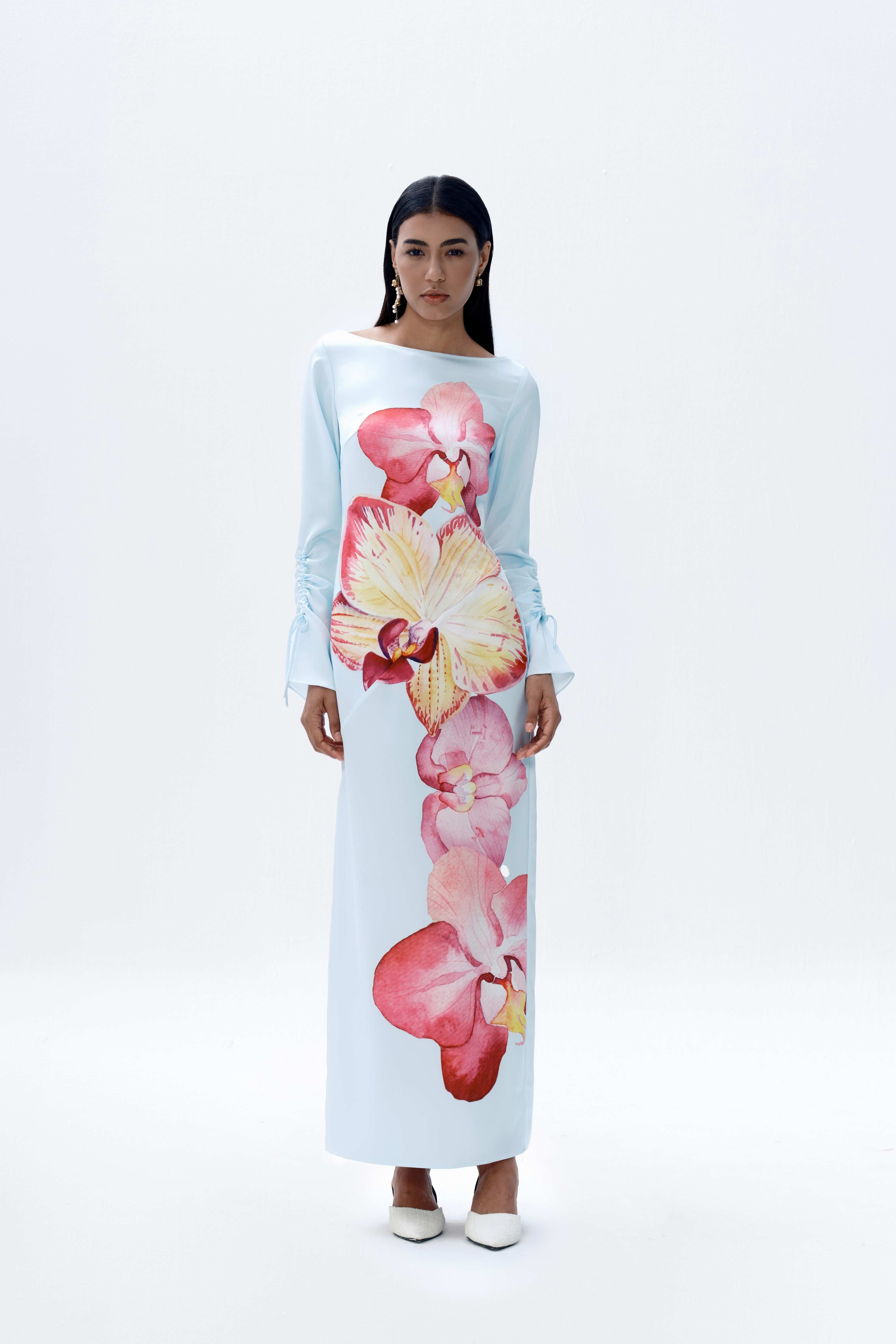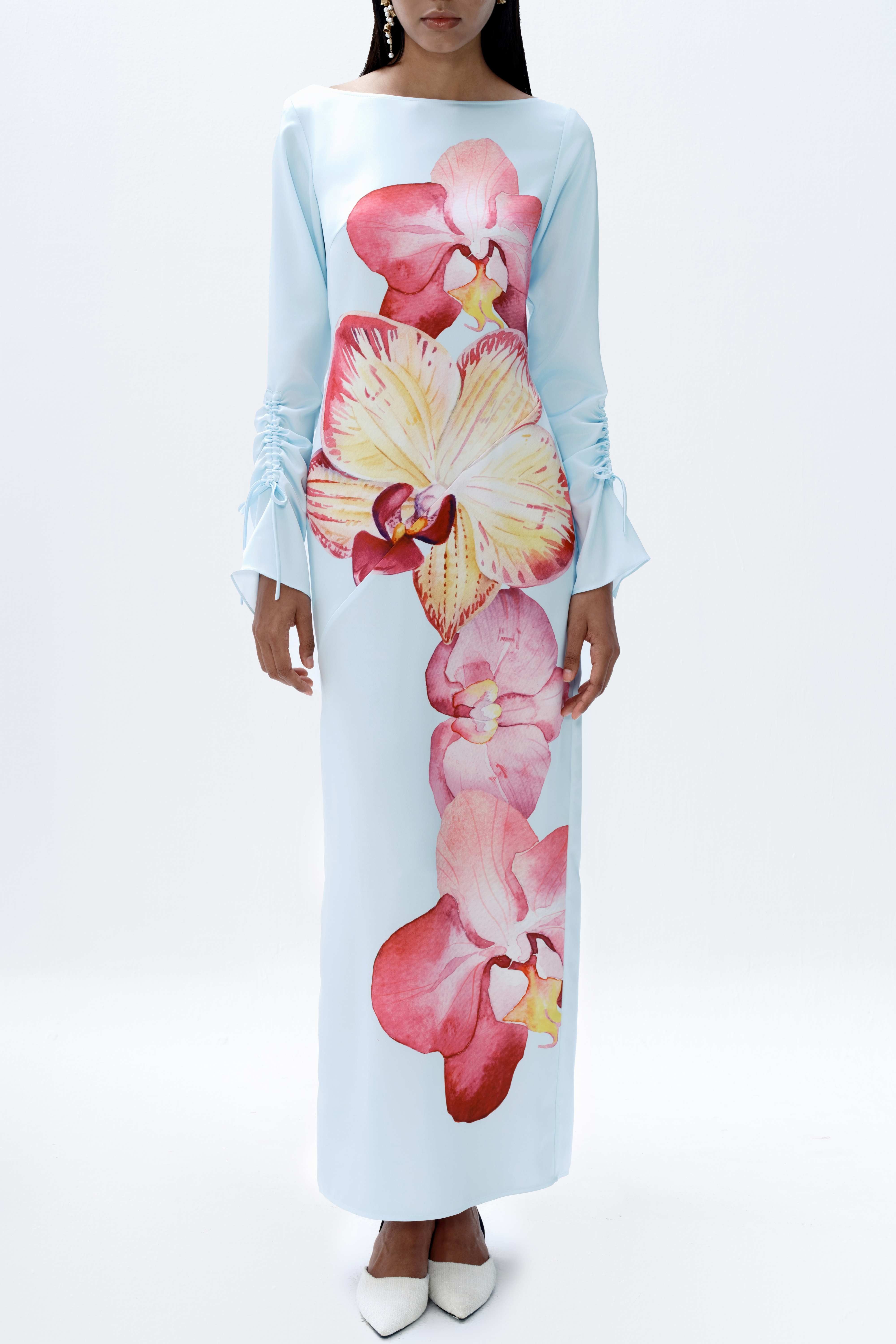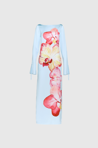 The Rye Dress is an easy-to-wear long-sleeved maxi cut from smooth satin with a soft sheen. Designed for versatility, it features a vivid orchid print set against a soft blue base. The silhouette is finished with a clean boat neckline and ruched self-tie sleeves, adding subtle detail while maintaining a streamlined shape.