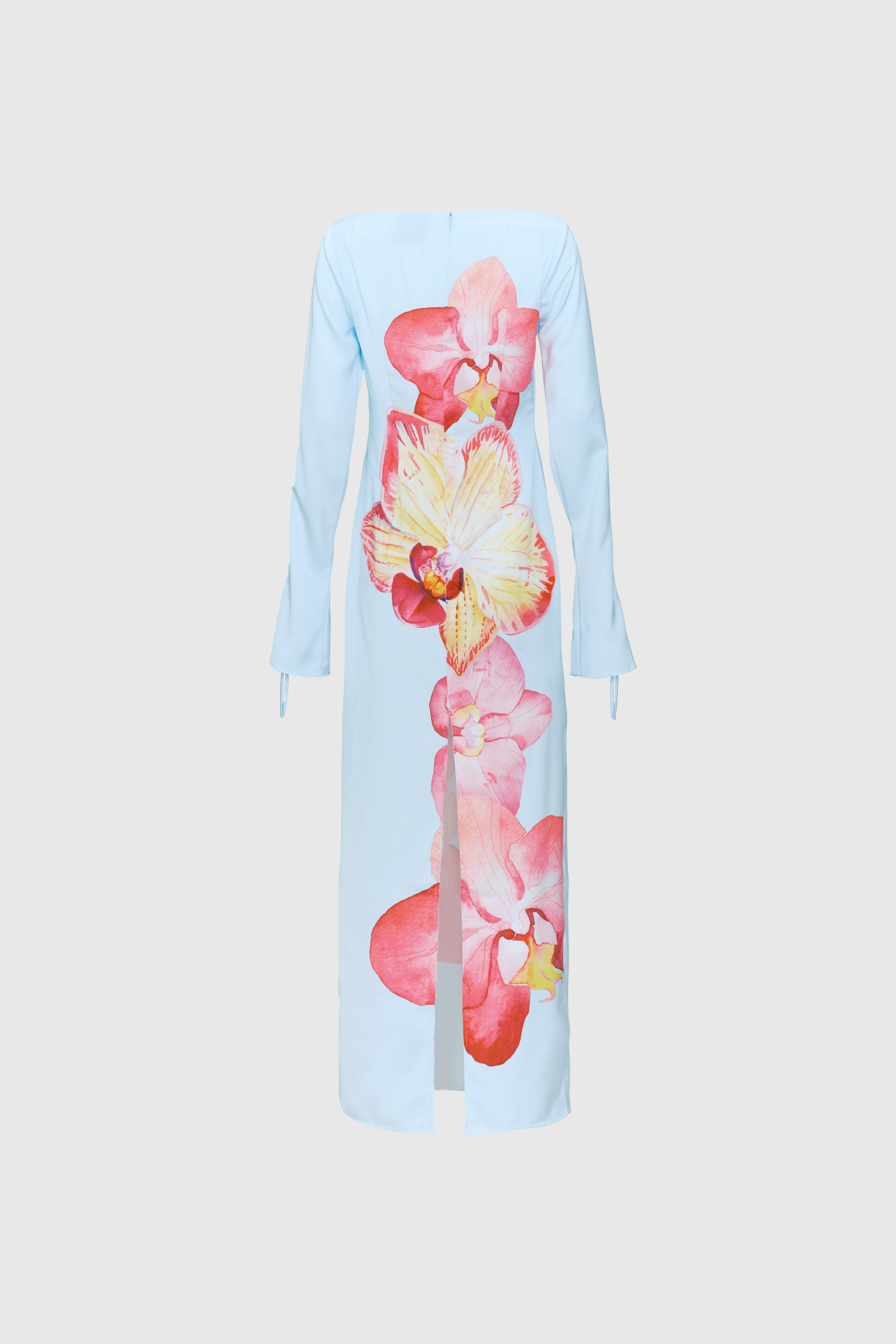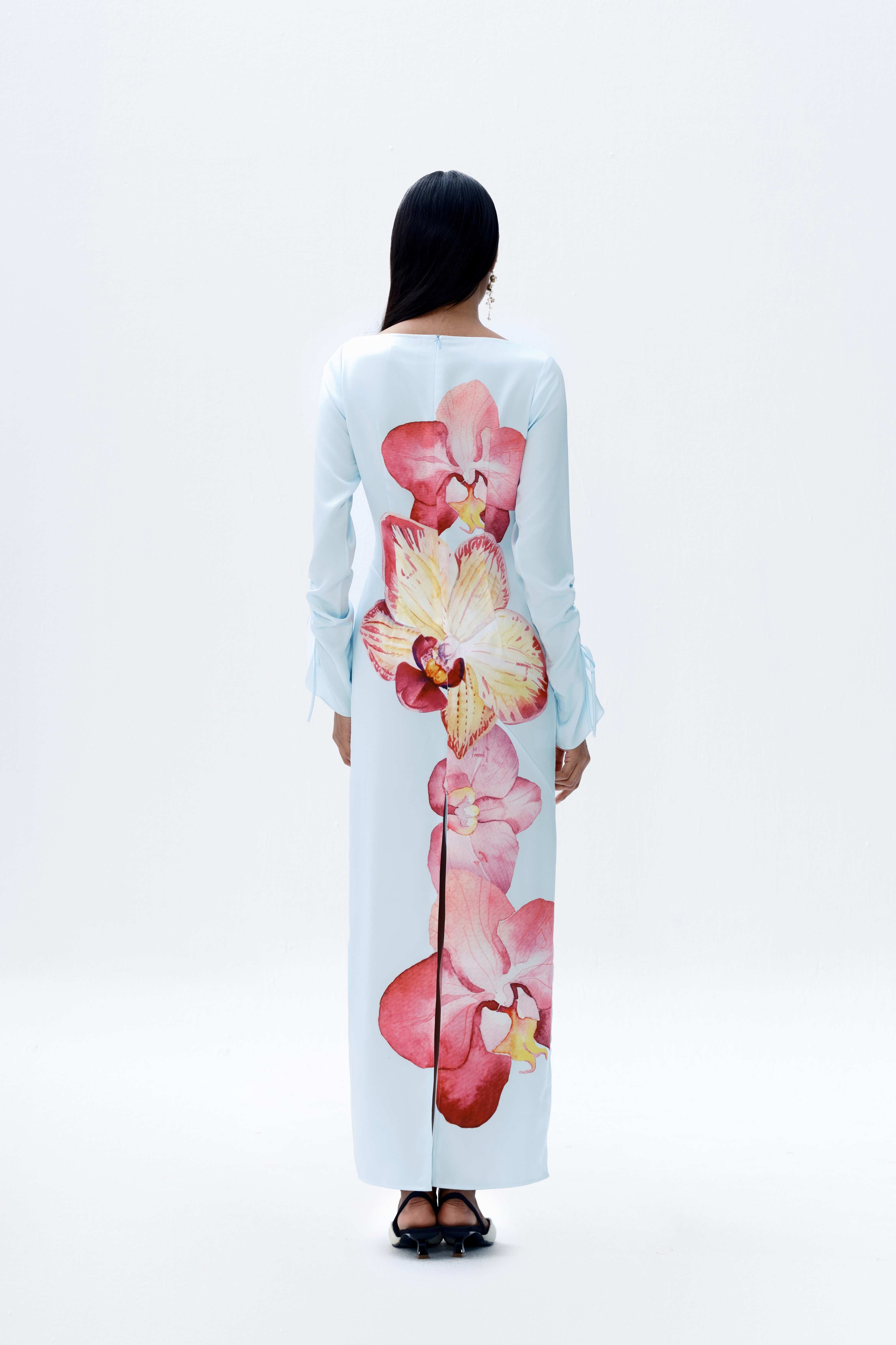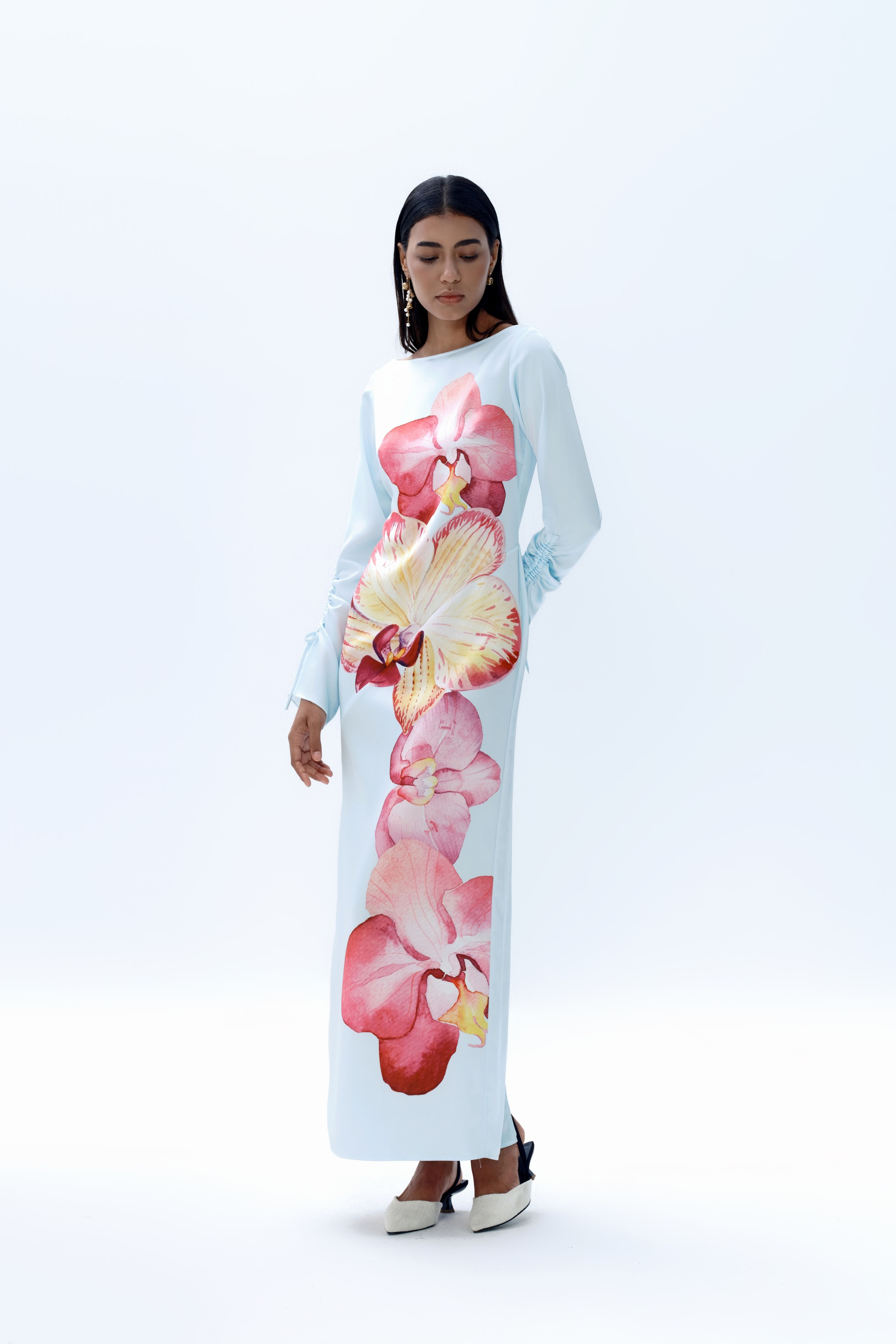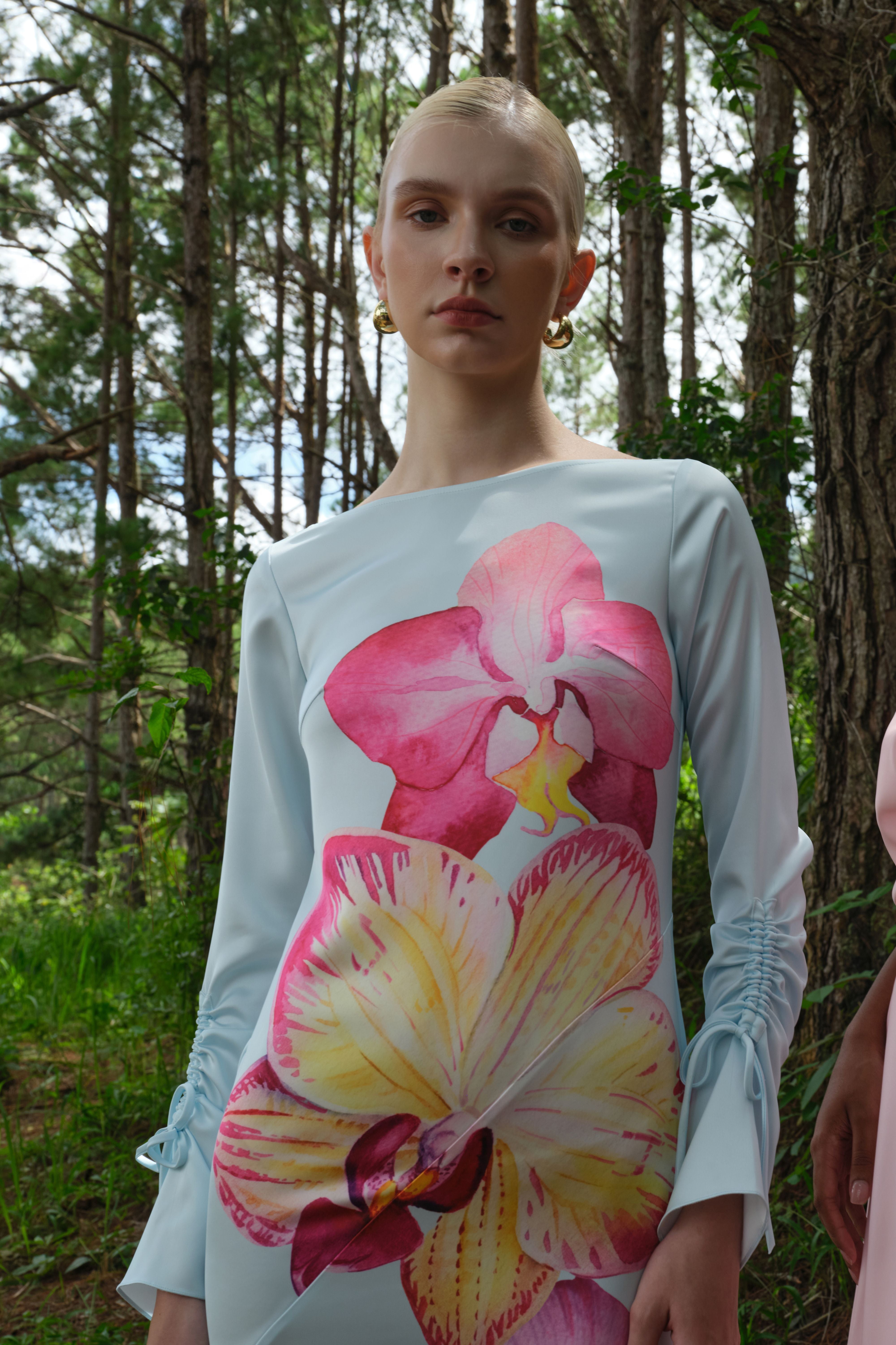 The Rye Dress is an easy-to-wear long-sleeved maxi cut from smooth satin with a soft sheen. Designed for versatility, it features a vivid orchid print set against a soft blue base. The silhouette is finished with a clean boat neckline and ruched self-tie sleeves, adding subtle detail while maintaining a streamlined shape.