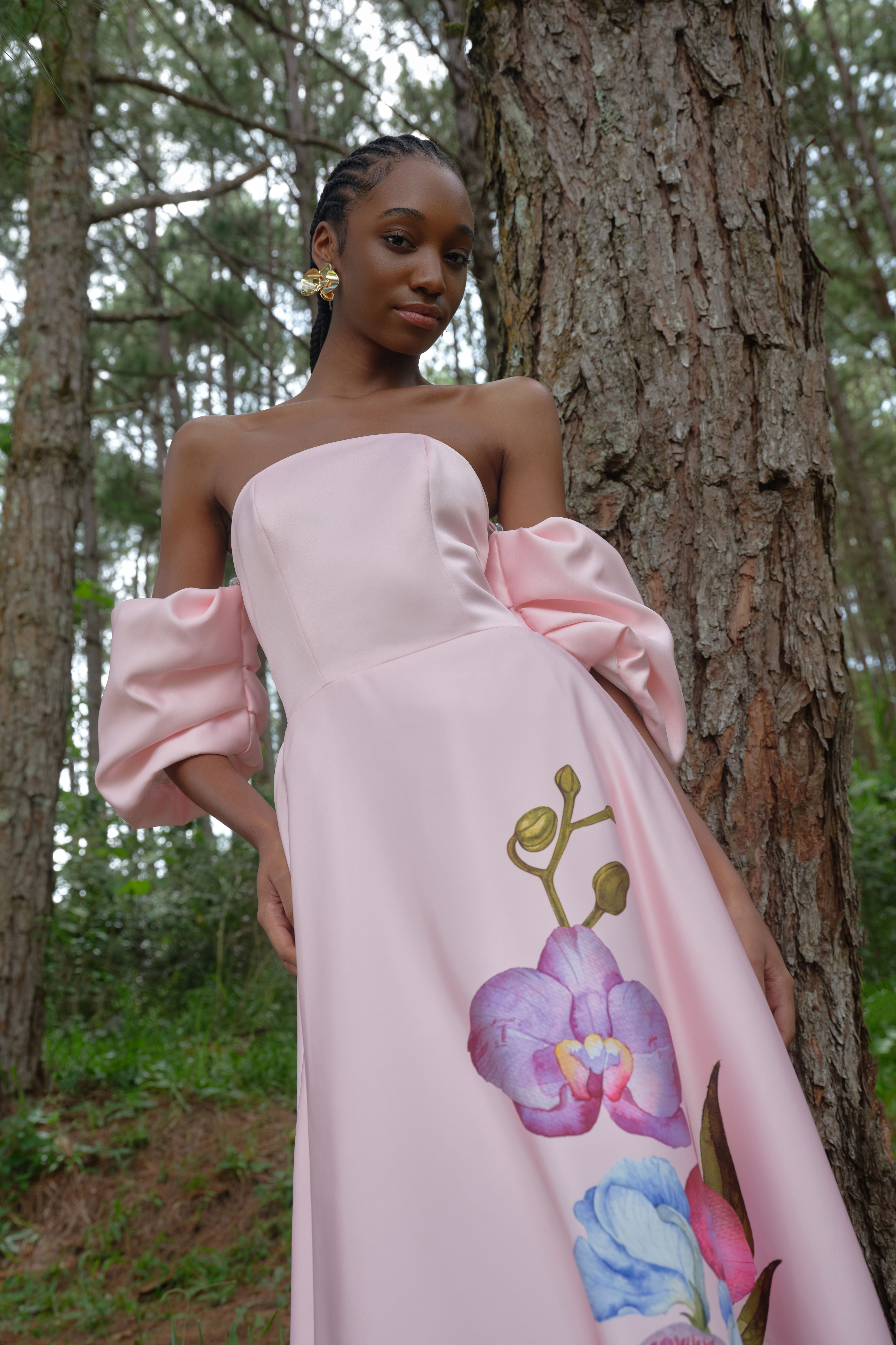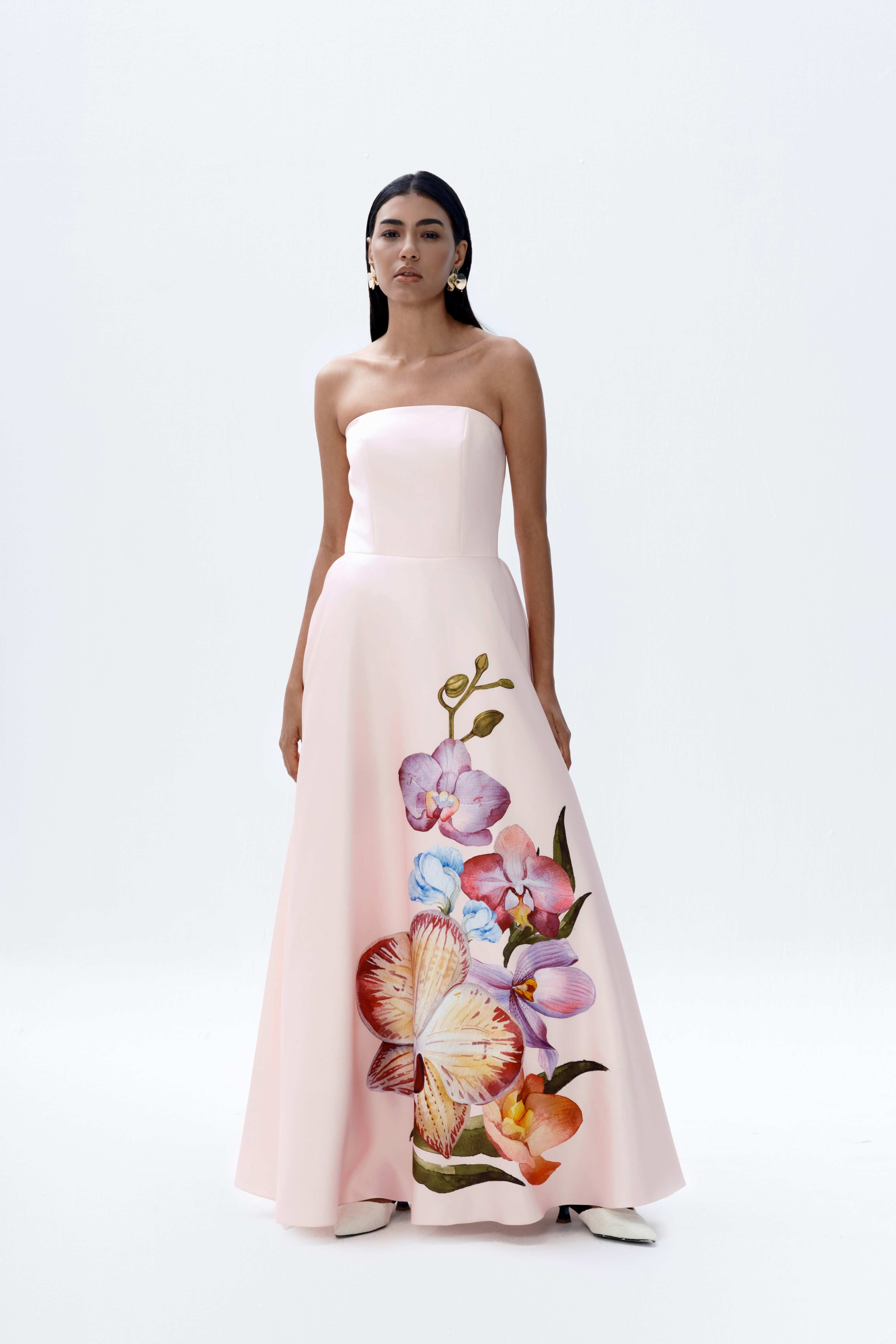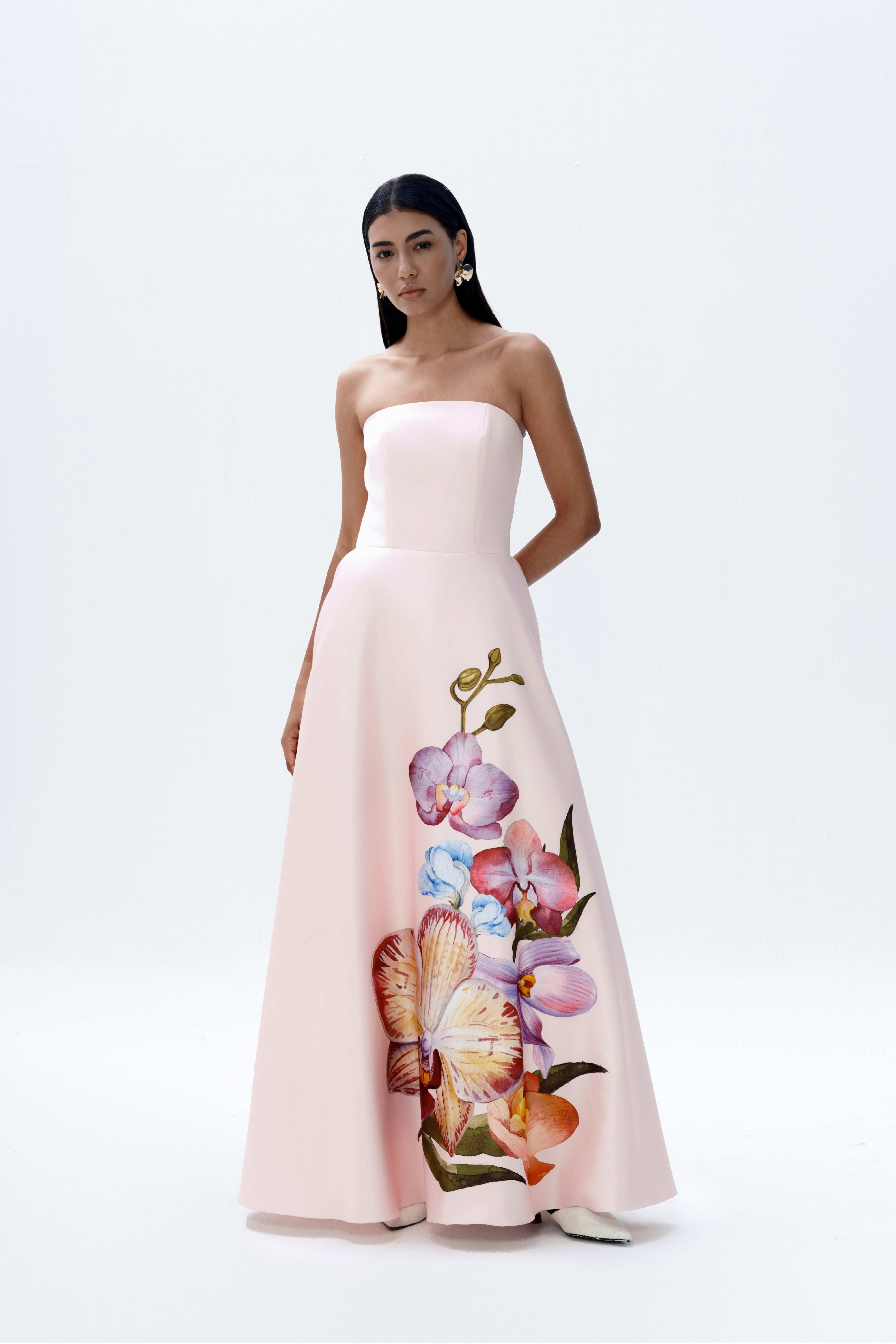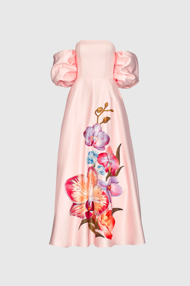 A signature silhouette returns in a fresh pastel pink, featuring a hand-painted orchid placement print. Cut as a strapless maxi, the design is defined by clean structure and considered proportion. Detachable short puff sleeves offer versatility in styling, while the weighted fabrication provides shape and controlled movement. An internal elasticated bust strap ensures a secure and adjustable fit.