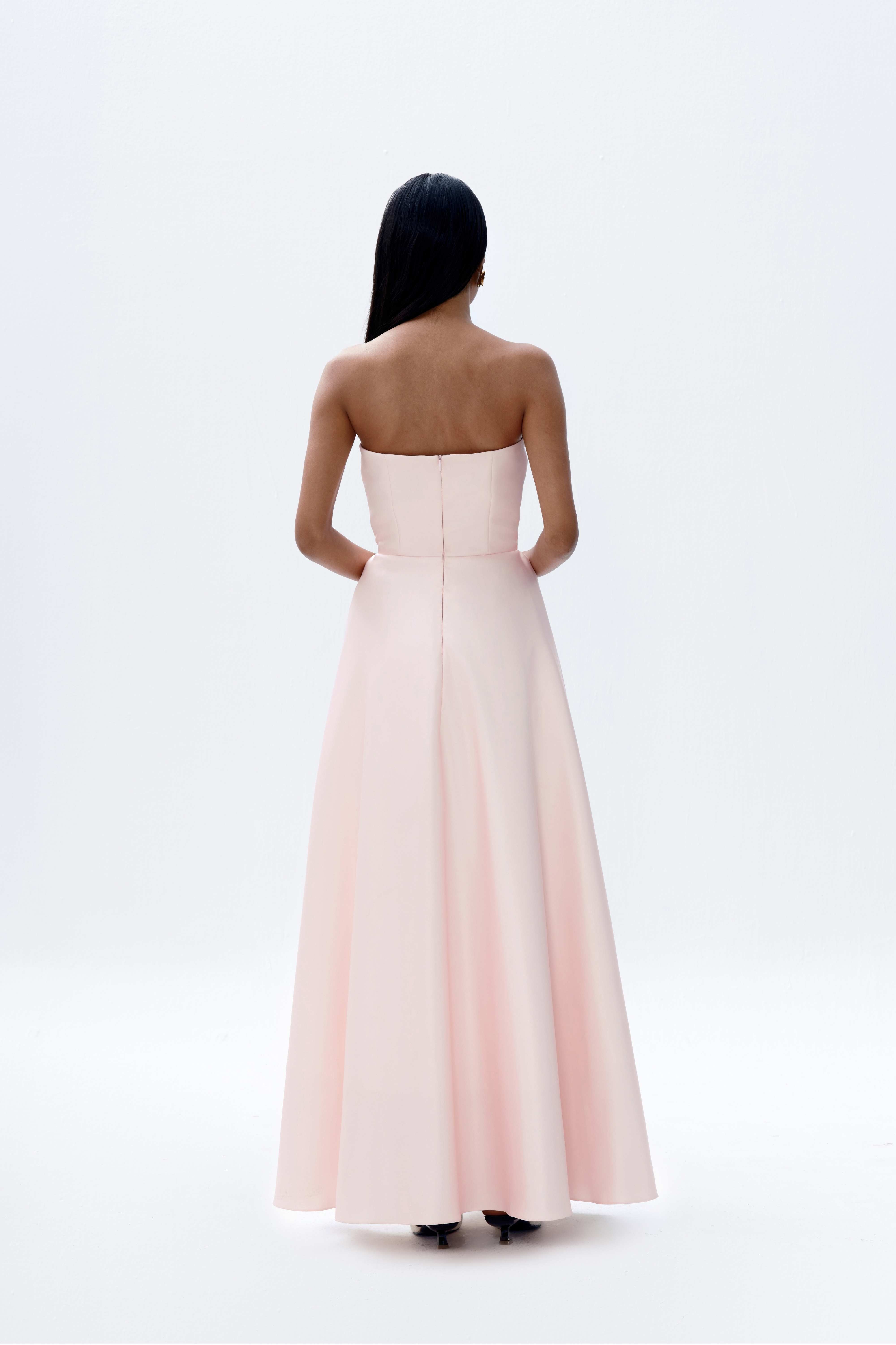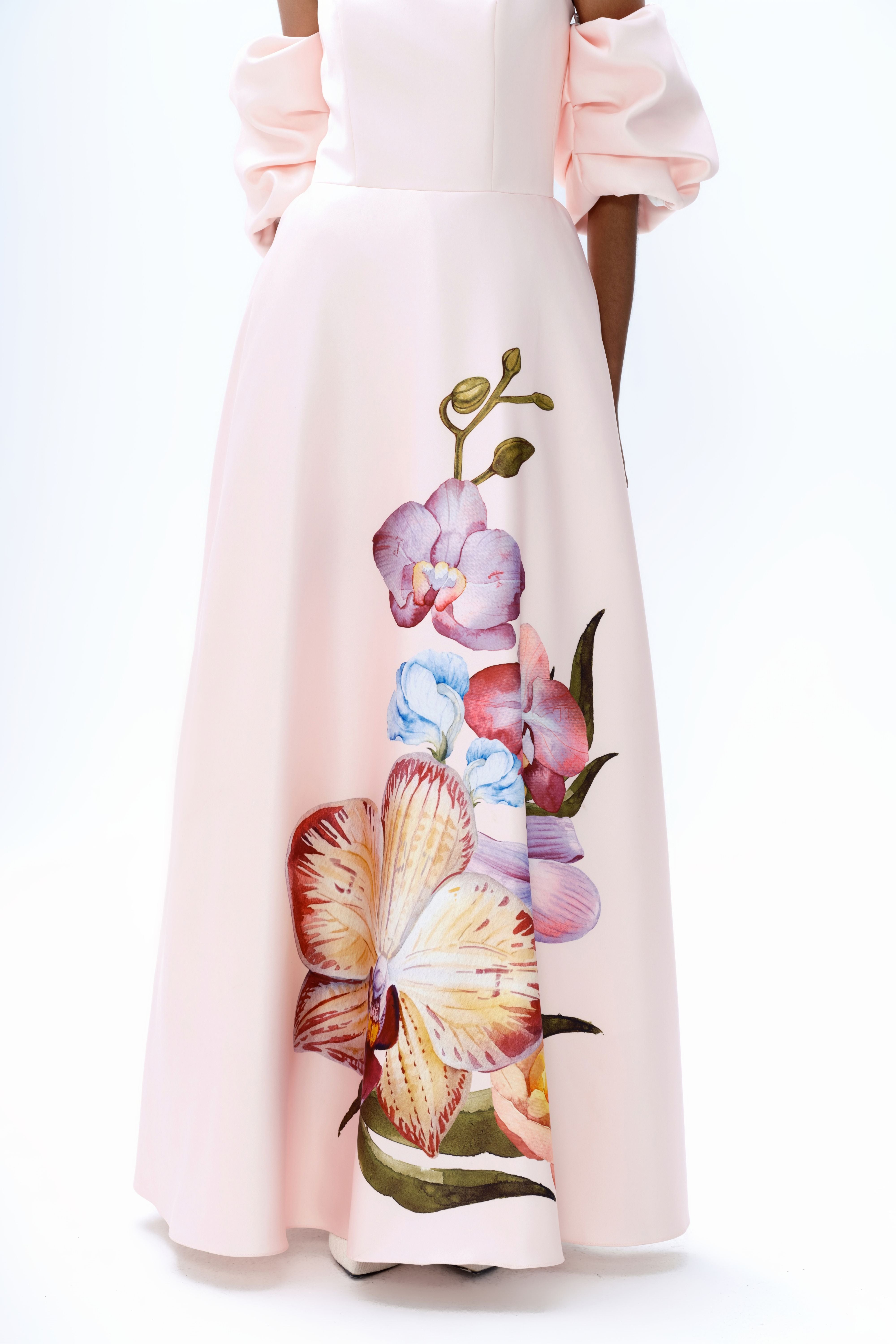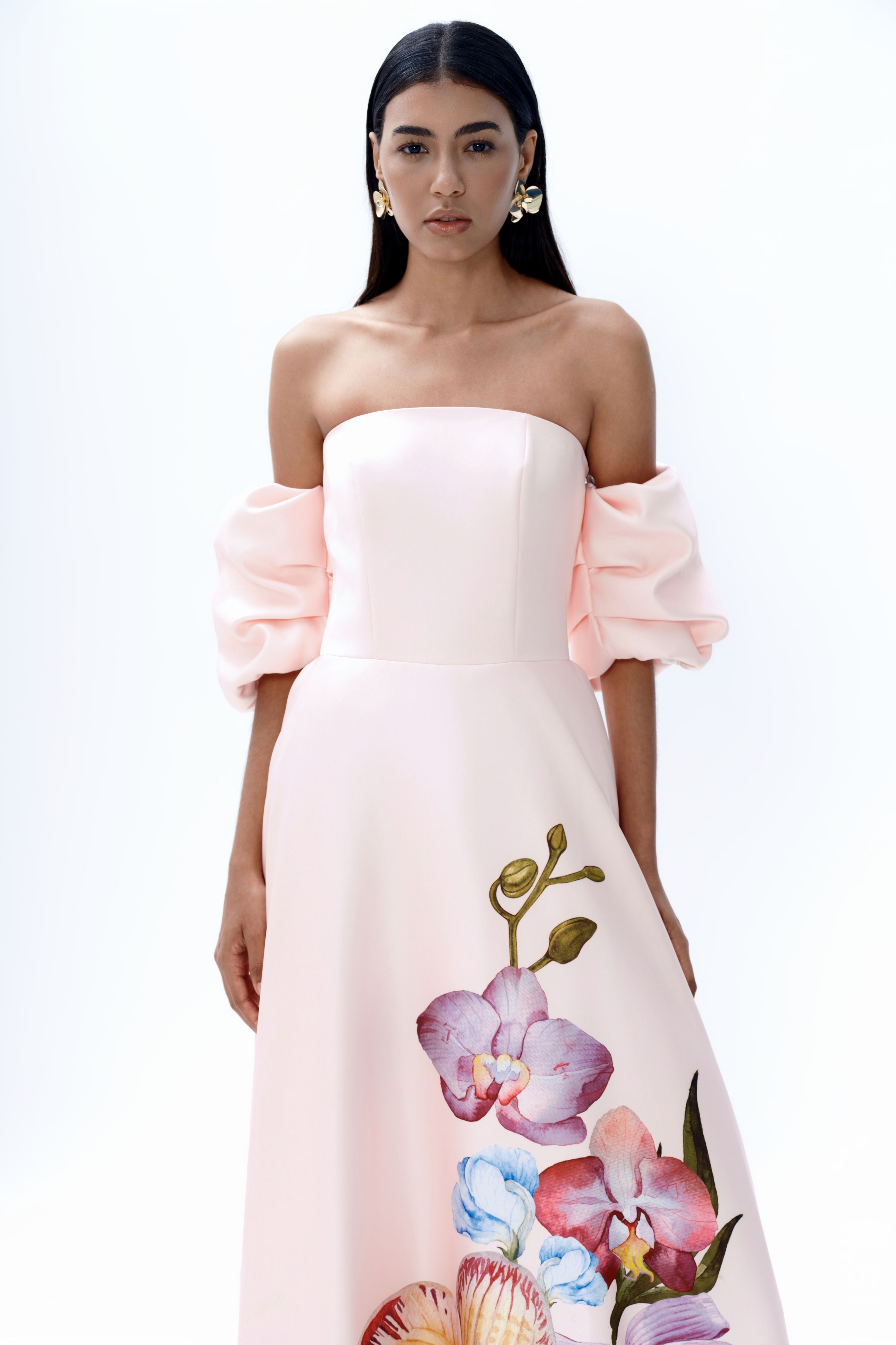 A signature silhouette returns in a fresh pastel pink, featuring a hand-painted orchid placement print. Cut as a strapless maxi, the design is defined by clean structure and considered proportion. Detachable short puff sleeves offer versatility in styling, while the weighted fabrication provides shape and controlled movement. An internal elasticated bust strap ensures a secure and adjustable fit.