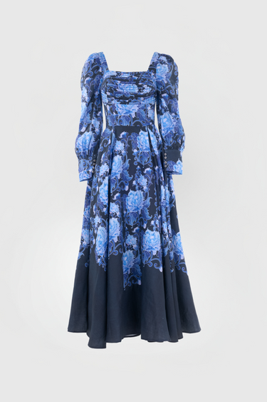 The Hidden Lagoon Maxi Dress from JUSTIN TONG's Enchanted Waters collection captures the mysterious beauty of hidden depths, featuring a blend of deep blue tones and serene floral patterns. It combines romantic aesthetics with contemporary tailoring, making it an ideal choice for your next sophisticated evening or enchanted garden event.