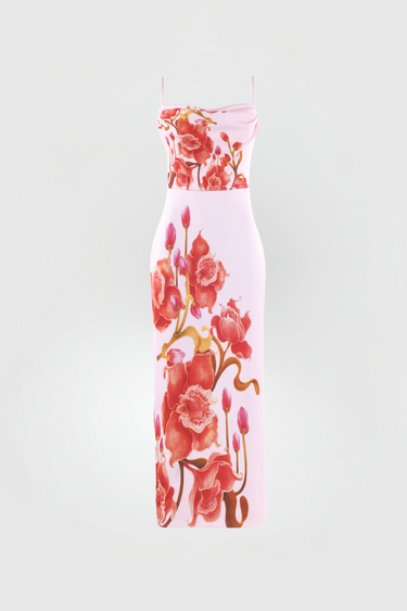 • Luxurious floral print depicting pink orchids, reflecting the gown's inspiration from natural mangrove landscapes.