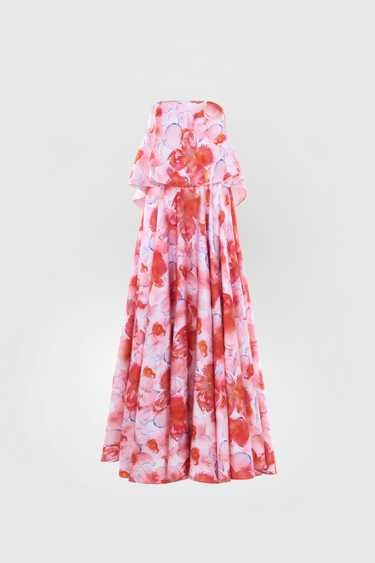 The Adrift Strapless Dress from JUSTIN TONG's Enchanted Waters Collection is a celebration of art and nature, combining a flowing silhouette with a vibrant floral print reminiscent of floating petals. This exquisite gown is designed to capture the essence of beauty and freedom, making it a perfect choice for elegant gatherings and special occasions.