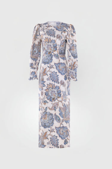 The Harper Midi Dress from JUSTIN TONG’s Enchanted Waters collection elegantly expresses heritage and craftsmanship. Made from 100% premium heavy linen, this dress features a timeless silhouette adorned in an intricate, tapestry-style floral print that echoes vintage botanical illustrations. With elegant puffed sleeves and a tailored bodice, this midi dress offers structure, sophistication, and seasonless style—perfect for garden parties and other sophisticated events.