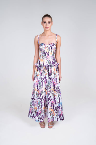 The Lavande Dress is a drop-waist maxi dress with a structured bodice and intricate ruffle detailing. Cut from a structured fabrication, the skirt holds its A-line silhouette from the hip to the lightly-weighted hem.