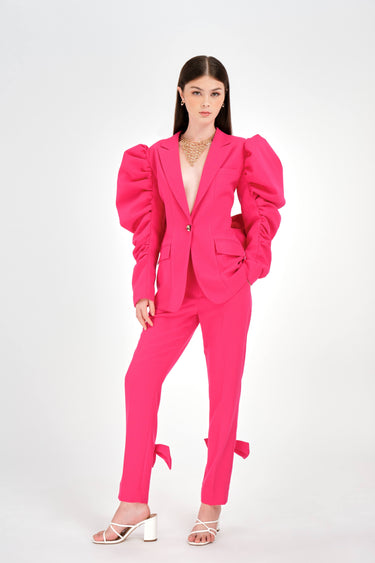 The Bow-Chic blazer will put you at the centre of attention. It is design-driven, bold, and unapologetically visible. Cut from hot pink fabric, the Bow-Chic Blazer has a fitted bodice, statement voluminous sleeves and a large detachable bow at the rear.