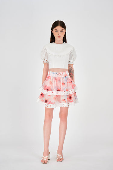 Dripping in embroidered trim detailing, the Crescent Blouse is a cropped cotton piece with petite puffed sleeves and a statement ribbed collar. It is designed to sit firmly on the wearer’s chest allowing the collar to cascade from the neck and shoulders.