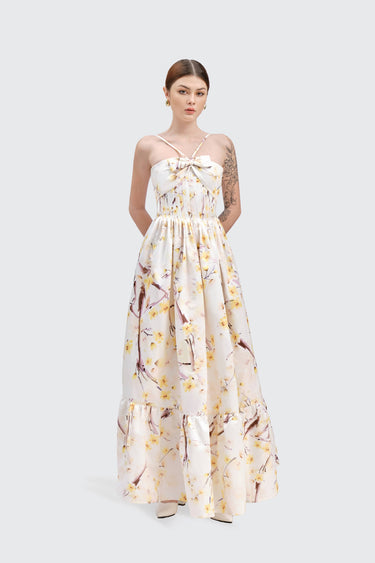 The Denny Dress is a strapless maxi dress with a pleated bust that seamlessly transitions to a free-flowing skirt. The effortless a-line silhouette is accentuated with a single wide ruffle around the circumference of the skirt. Ornate all over ochna print bow and white strap details elevate the dress while complementing the light hues throughout the watercolour ochna illustration.