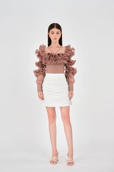 Dress to impress in the chic and sexy Ruffle Blouse. Sculpted from organza fabric that has been set into fine accordion plates with metallic gold undertones that glisten in the moonlight. This statement blouse is complete with a boned corsetry bodice, thin collarbone straps, and buttoned sleeve cuffs.